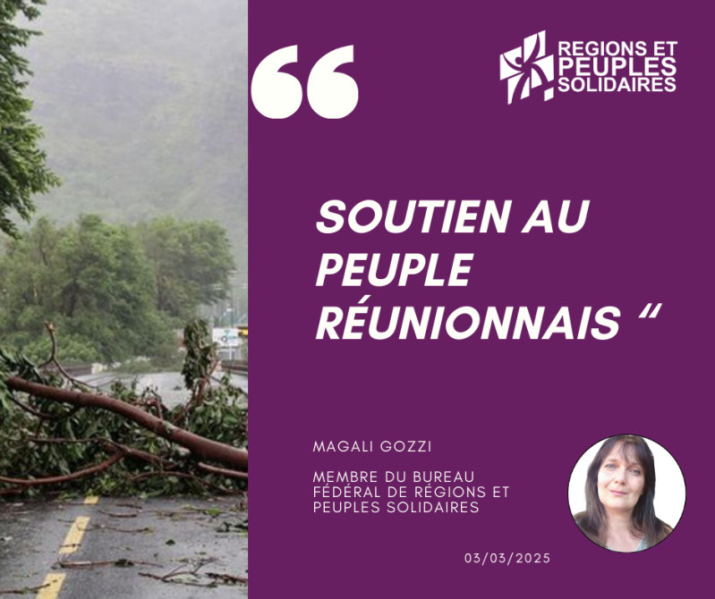 Alors que la Réunion traverse cette épreuve particulièrement difficile, Régions et Peuples Solidaires exprime avec force son soutien le plus sincère à tous ceux qui sont touchés par cet événement, et souhaite une reconstruction rapide et efficace des structures de l’île, notamment des exploitations agricoles particulièrement touchées.
